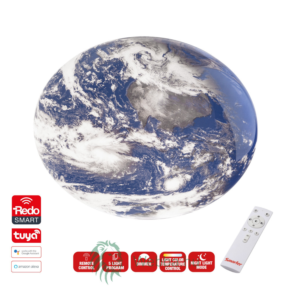 A Terra LED mennyezeti lámpa egy TUYA vezérlőrendszerrel felszerelt világítótest , matt fehérre festett fémszerkezettel és nyomtatott metakrilát diffúzorral.