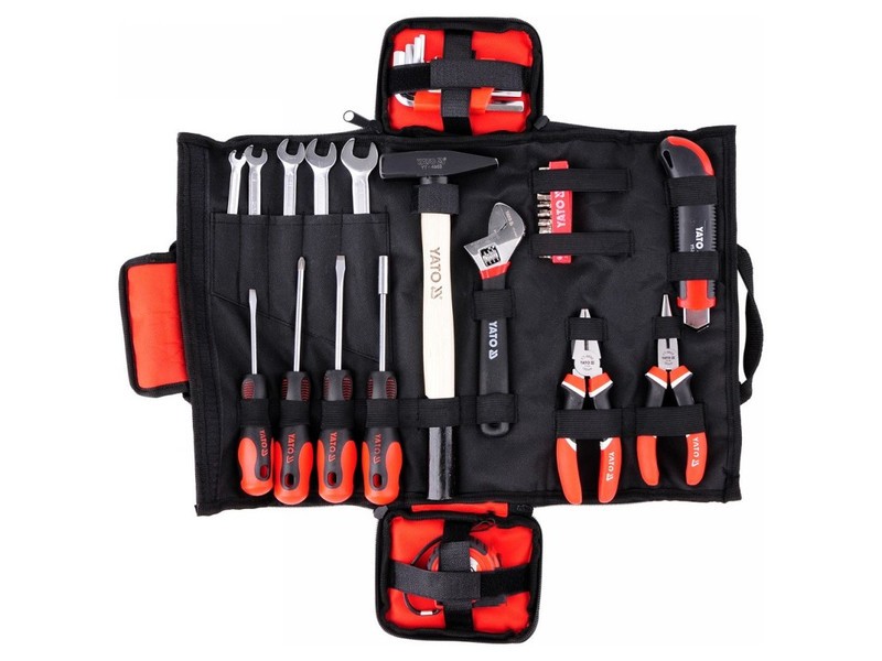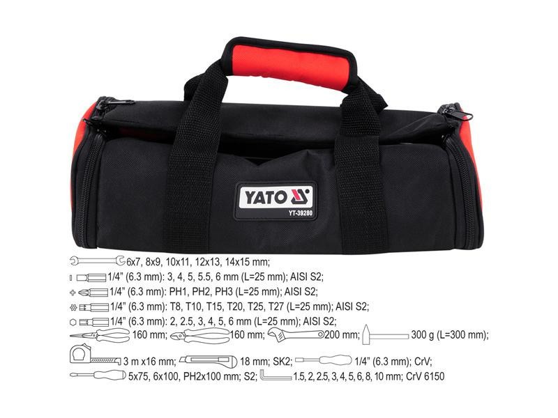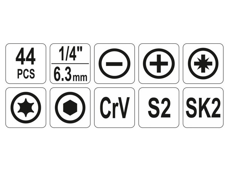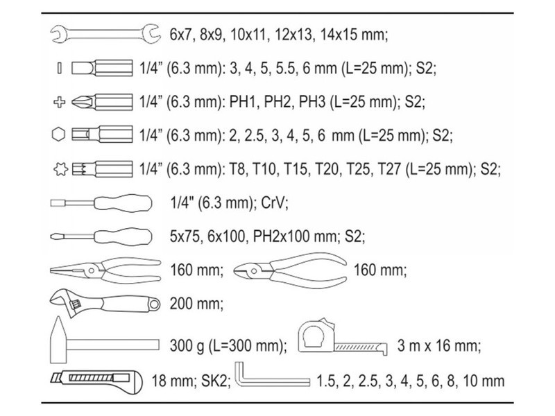 • 6x7, 8x9, 10x11, 12x13, 14x15 mm • 1/4”: 3, 4, 5, 5.5, 6 mm/L=25 mm AISI S2 • 1/4”: PH1, PH2, PH3/L=25 mm AISI S2 • 1/4”: T8, T10, T15, T20, T25, T27/L=25 mm AISI S2 • 1/4”: 2, 2.5, 3, 4, 5, 6 mm/L=25 mm AISI S2 • hosszúcsőrű fogo: 160 mm • oldalcsípő: 160 mm • franciakulcs: 200 mm • kalapács: 300 g/L=300 mm • mérőszalag: 3 m x16 mm • törhetőpengés kés: 18 mm SK2 • bithegy tartó: 1/4” CrV • csavarhúzó: 5x75 mm, 6x100 mm, PH2x100 mm S2 • imbuszkulcs: 1.5, 2, 2.5, 3, 4, 5, 6, 8, 10 mm CrV 6150