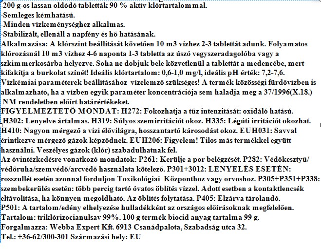 A Maxi Klór 200 gramm. A klórtartalmú tablettákat a gyors klór kezelésére használják, lassan oldódnak a hosszú távú fertőtlenítéshez, és felszabadítják a szabad klórt, mivel feloldódnak.